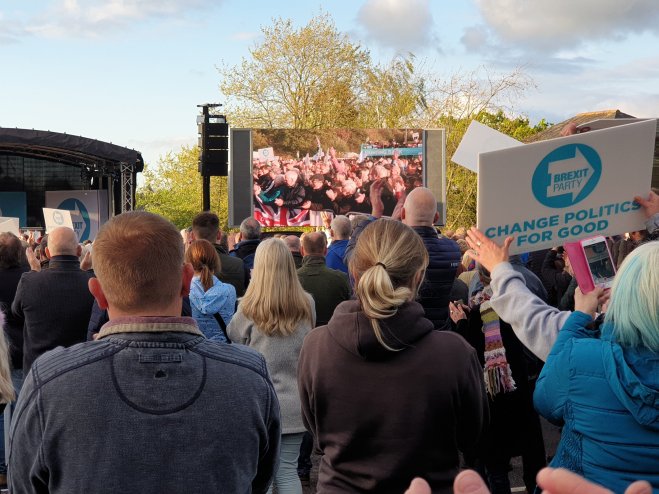 Went to Brexit party rally at dreaded Trago Mills last night.Briliant summer evening, hedgerows blazing with red campion, bluebells, the odd primrose persevering and oceans of wild garlic.Haytor standing out in relief high above usmagnificent against the sunset.Black and white signs for “Brexit Party ushering us in and a security man in black and sort of flak jacket. It had just begun as I drove into car park. Listened to speakers taking to stage with window wound down as searched for parking. Dry sunny and windless but cold. Bitter cold. Woolly hat and scarf job.Nigel and Ann W awesome. Strutting their stuff. Indignant, outraged and determined. Many interesting candidates. Asian nurse, Elderly Admiral type who started at Brittania College, Totnes Yoga teacher with native-American type dangly earrings. “Another very brave Lady putting her head above parapet. ” said Richard er..?, the slick businessman, MC guy. One candidate/member had given her husband one of her kidneys he told us.Film crews wandering about with furry booms. Many young women with blue or turquoise dipped ended hair a la Totnes, piles of white and turquoise polysyrene campaign boards for us to wave and bang on. The Brexit party bus. A pair of scruffy mongrels on leads, small mangy, poodle type standing on hind legs and batting at each another paws around each others neck performing a long, comical dance- owners with their eyes fixed on the stage, oblivious.Lots of shouting, booming and placard waving. Union Flags affixed to long poles with Devon County flags on top fluttering in the evening sun.And all the while the plaintive calls of the Trago Mills peacocks could be heard, often emitted as applause for a speaker burst from the crowd, as if to jolly us all along…..