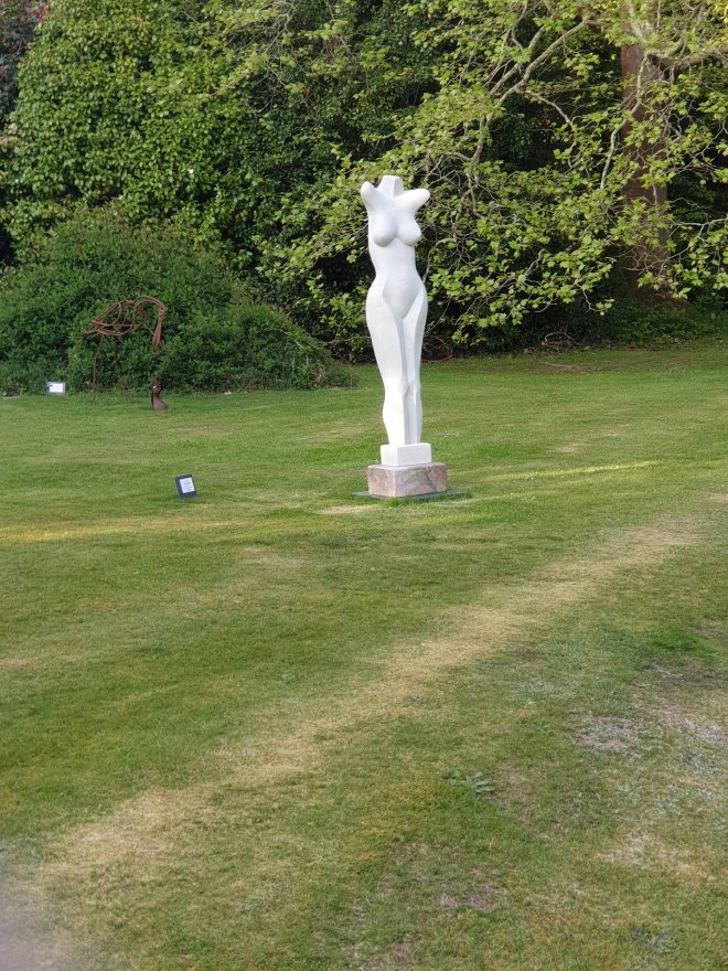To Dartmoor, briefly, for avant garde art exhibition. Chilly but sunny and many interesting exhibits distributed round grand, immaculate garden. A few mates to chat with. I liked the Lurcher on the lawn best and a horse head in bronze in a flowerbed. Old Father Thames preferred the nude.