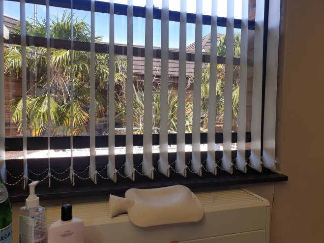 A new hip. A fabulous week in hospital, NHS “Choose and book”. Private room with comfort and privacy and gloriously quiet at night but busy during the day. Meals brought in that I did not have to wash up. Sunny all week and sound of seagulls occasionally squealing outside, glorious view of palm trees in small courtyard outside through blinds. Ideal combination- plenty of time to nap in private as could shut door on noise in corridor and snooze at will. Bit of a scary nurse on duty at nights- (probably highlight of my stay was when she grumpily bent down to pick up a kidney bowl of